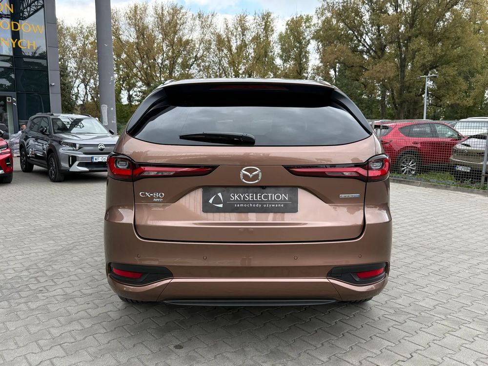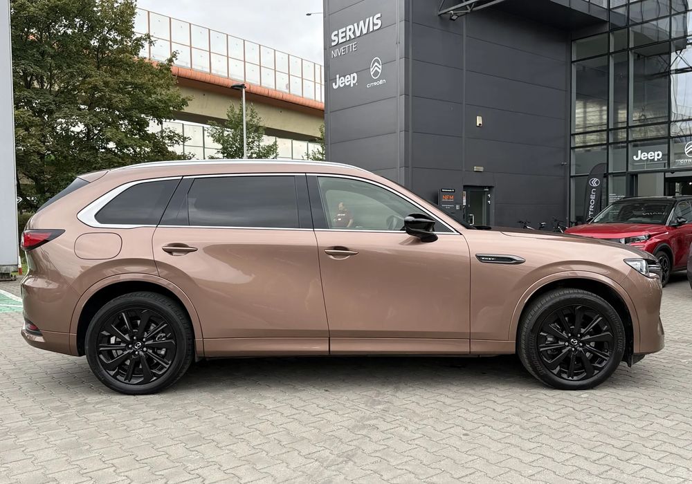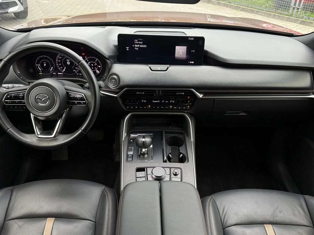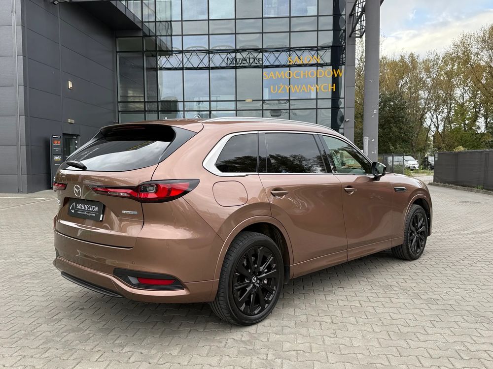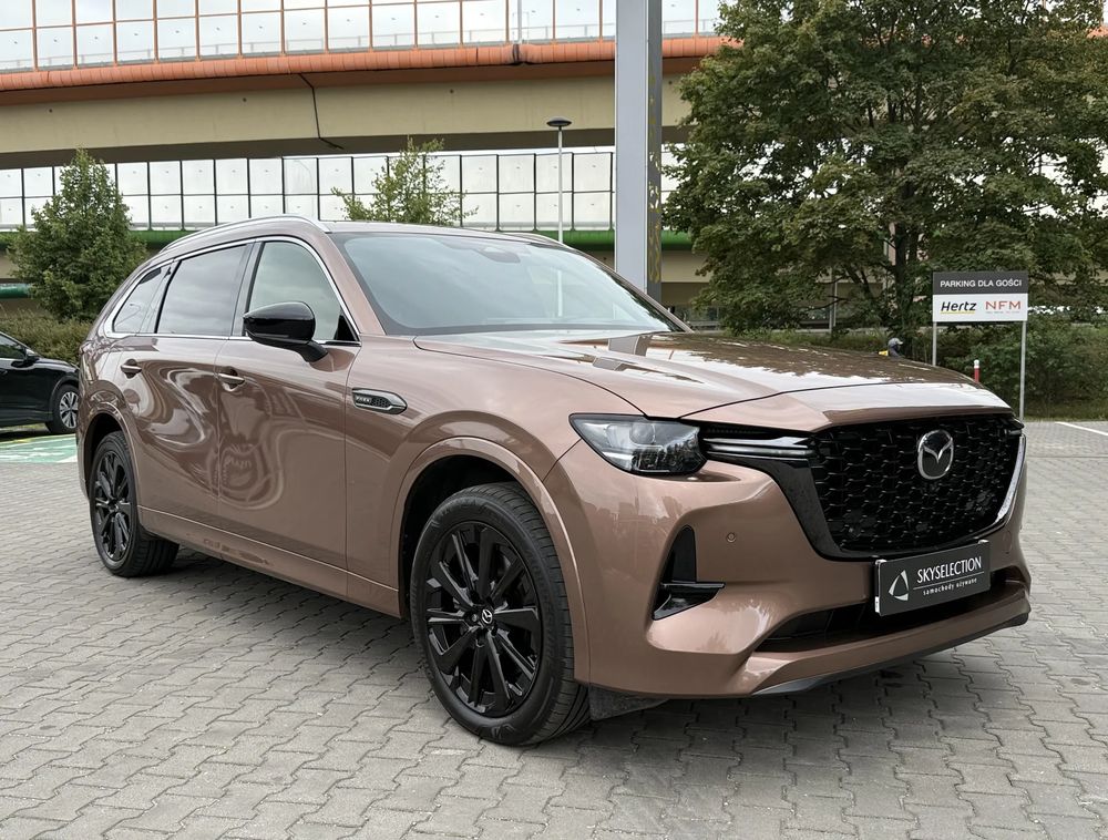 MAZDA CX-80 z silnikiem hybrydowym typu plug in o pojemności 2.5 i łącznej mocy 327 KM w wersji wyposażenia HOMURA PLUS w unikalnym kolorze MELTING COPPER M, w wersji 6 osobowej z fotelami kapitańskimi