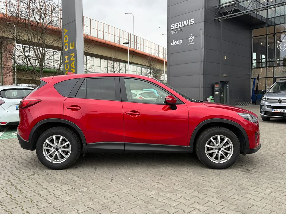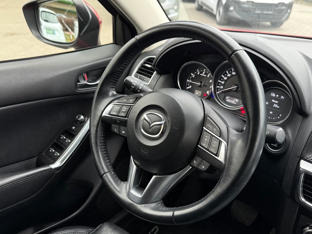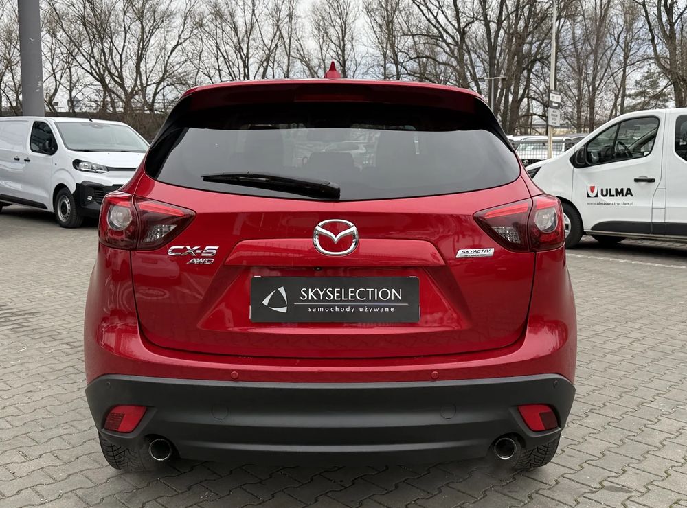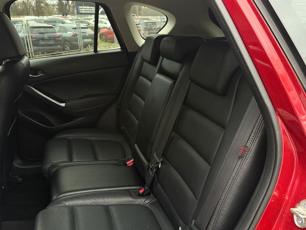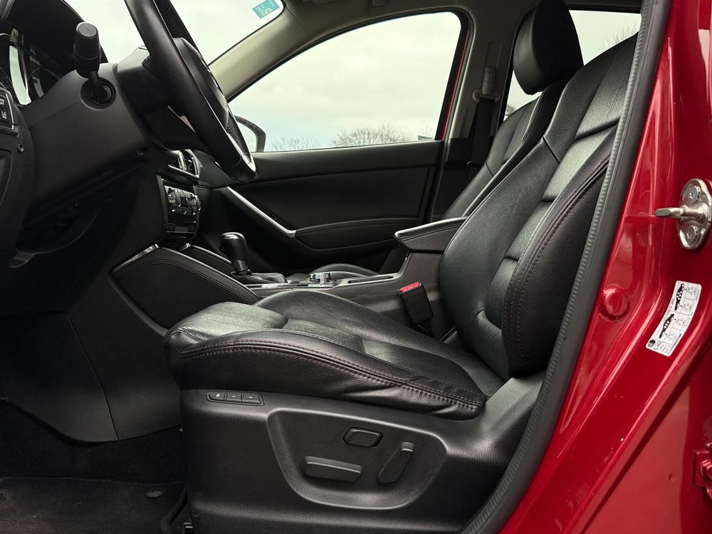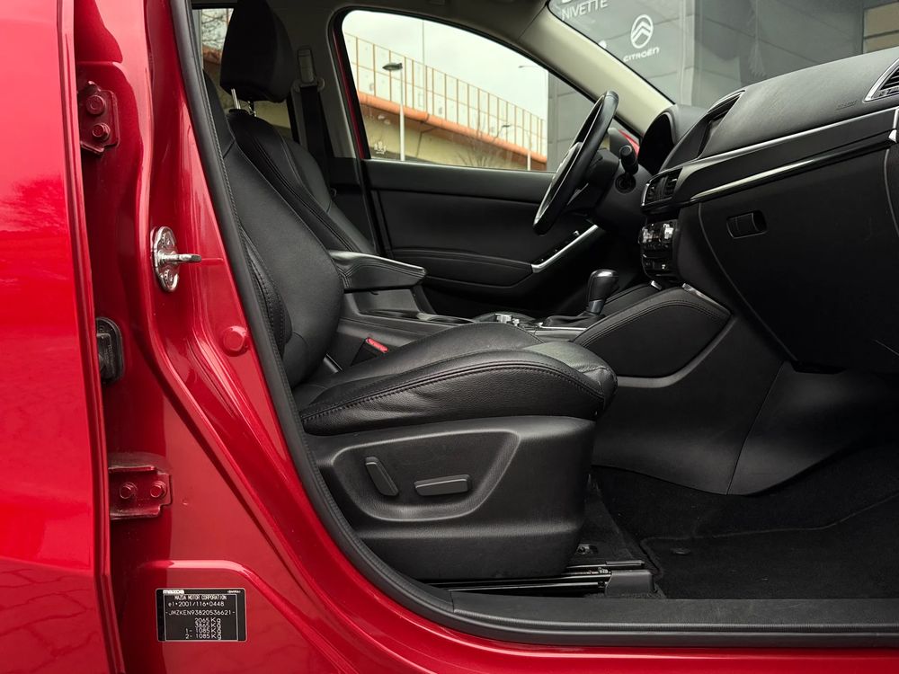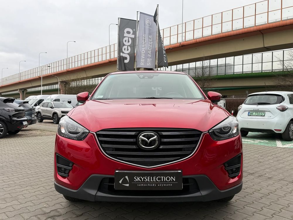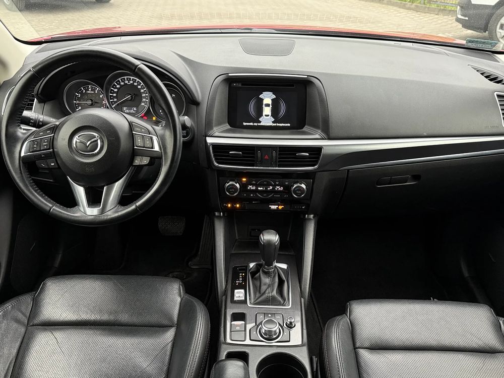 MAZDA CX-5 z 2016 roku, silnik benzynowy 2.5 o mocy 192 KM. z napędem na cztery koła AWD w wersji wyposażenia SKY PASSION z czarnymi skórzanymi fotelami, jest to przestronny SUV z 5 miejscami, idealny na rodzinne wyjazdy i codzienne użytkowanie.